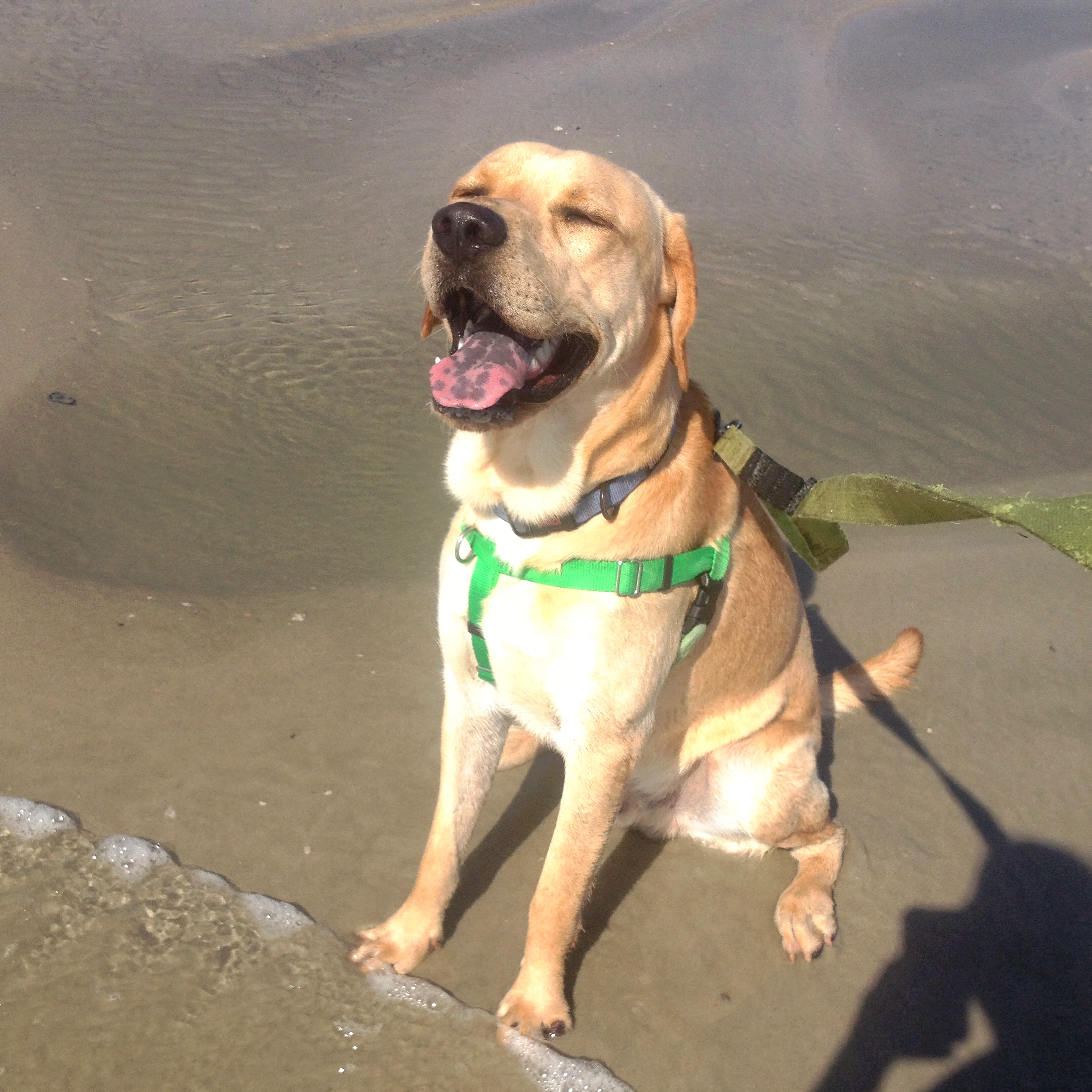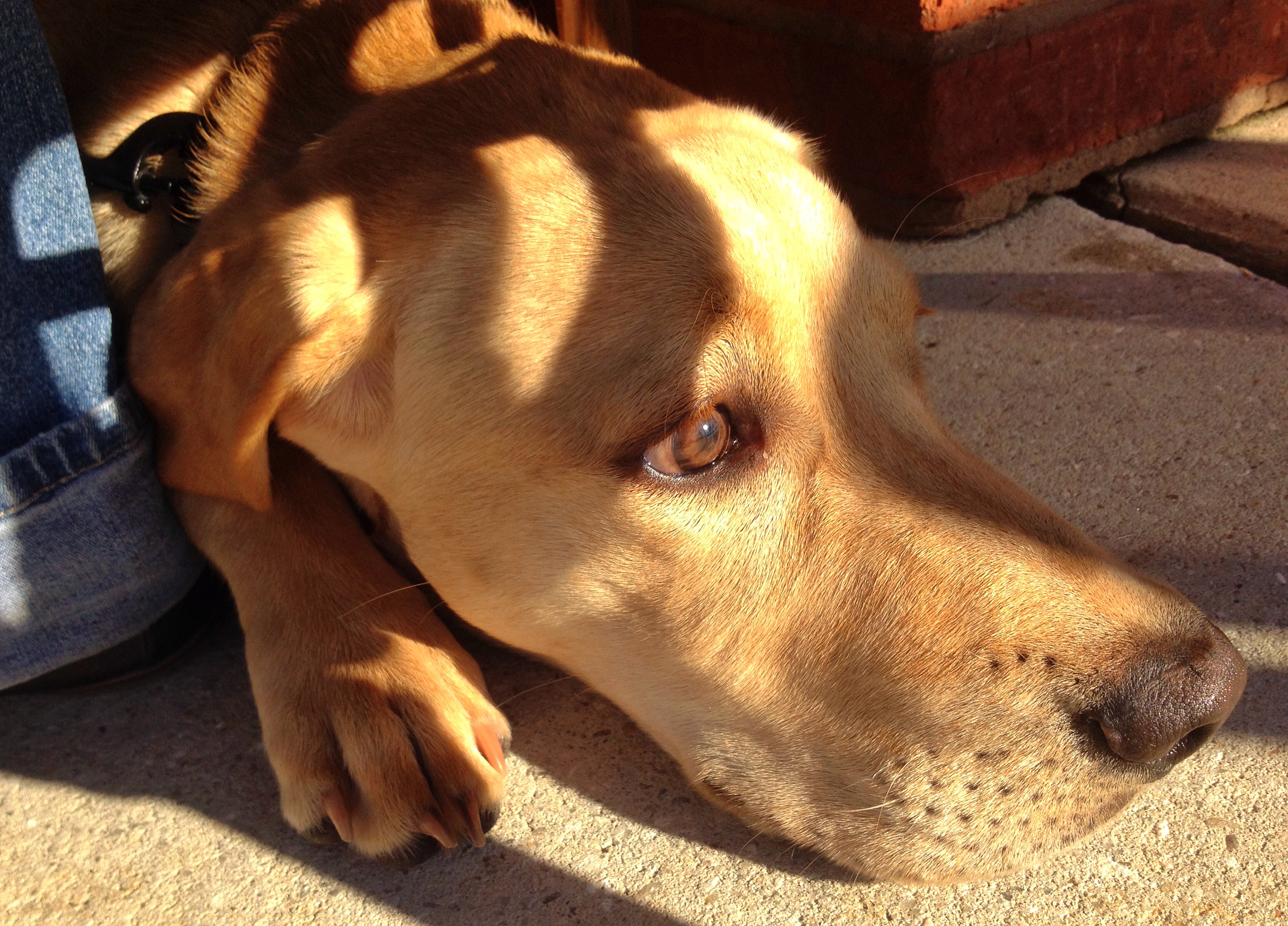 Young yellow dog’s story: the world is scary but I think I’m brave enough to watch it from the safety of mom’s feet.