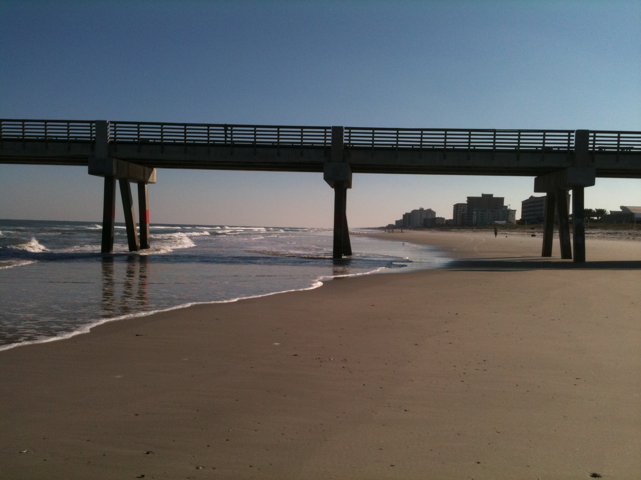 “Him” was a pelican meandering between the pillars of the Jacksonville Pier at the water’s edge. Intermittently he would swim a few feet when the ocean lapped up around him and then return to walking as the water line receded. Several pictures of the pelican were already on my iPhone before the man on the bike warned me to stop.